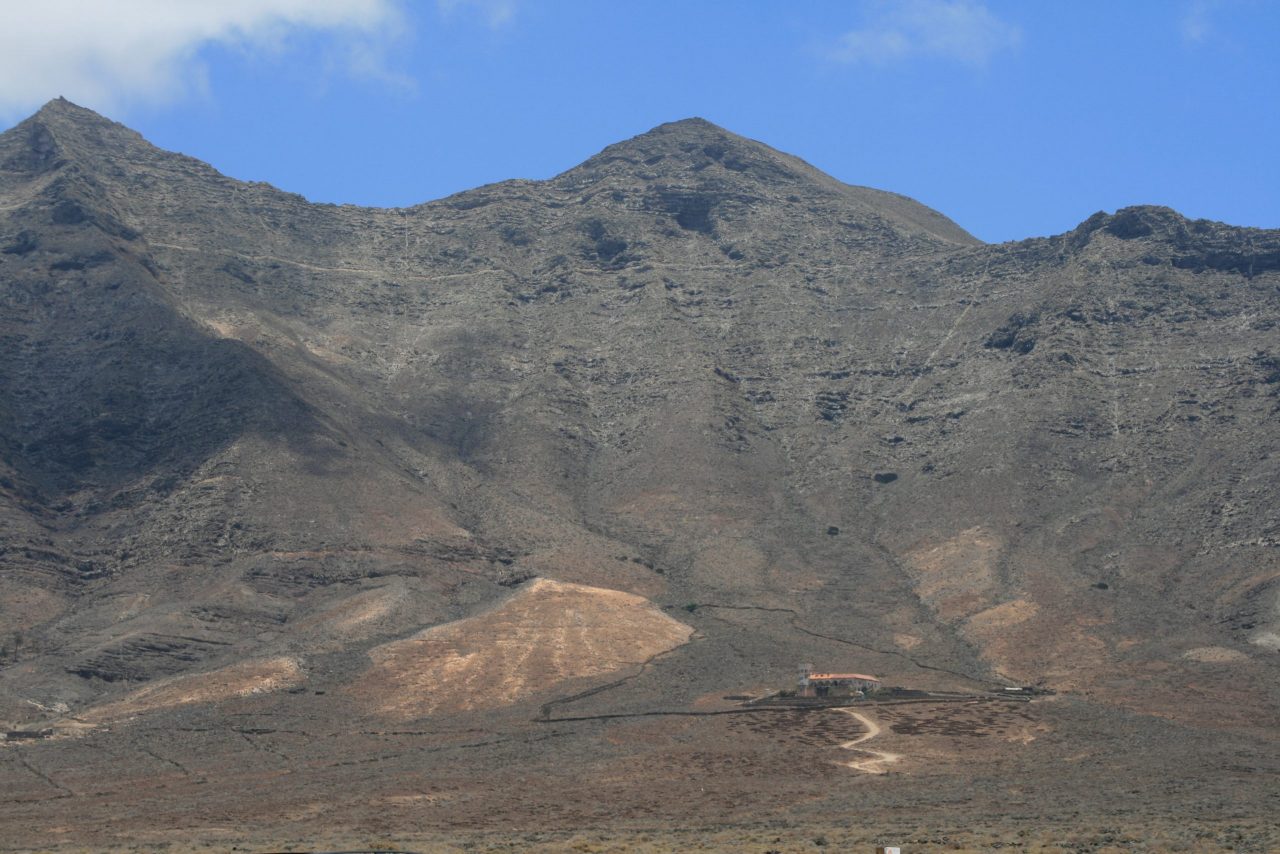 Celem naszej wyprawy była jedna z dzikich plaż – Playa de Cofete. Nie pamiętam dokładnie dlaczego wybraliśmy ten kierunek i skąd czerpaliśmy informacje, ale podejrzewam, że przeczytaliśmy, że jest tam dziko, pusto i naturalnie i to nas przekonało. Droga do tej plaży nie należy do najłatwiejszych, jest kręta, wąska i szutrowa. Trzeba mieć doskonałe umiejętności w prowadzeniu auta i najlepiej samochód 4×4. Nasz chevrolet niestety nie miał wskazanego napędu, ale na szczęście Kamil posiadał wymagane doświadczenie za kierownicą, które bardzo się przydało. Były momenty kiedy chowałam głowę między nogi, bo – zapomniałam wspomnieć – mam lęk wysokości. Dojechaliśmy, zaparkowaliśmy i ruszyliśmy na spacer po chyba najbardziej wietrznej części Fuertaventury. Rzeczywiście było prawie pusto, za nami przyjechały jeszcze dwa auta i trzy osoby wylegiwały się na plaży. Widoki były przepiękne, z jednej strony szalejący ocean a z drugiej szczyt Pico de la Zarza.